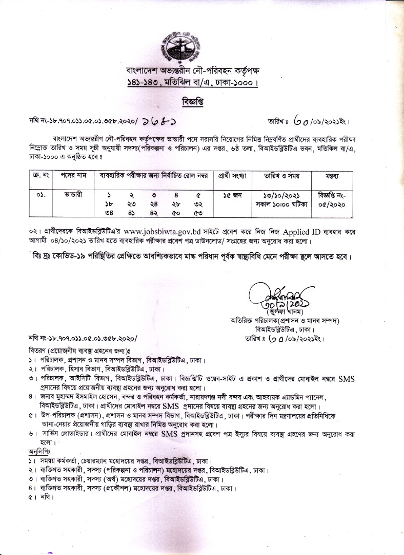 কর্তৃপক্ষের সাধারণ পুলের স্থগিতকৃত (অফিস সহায়ক, টার্মিনাল গার্ড/নিরাফত্তা প্রহরী, ভান্ডারী, ঝাড়ুদার/পরিচ্ছন্নকর্মী পদে নিয়োগের নিমিত্ত মৌখিক পরীক্ষা আগামী ২০/০৬/২০২১ তারিখ হতে ১১-০৭-২০২১ তারিখ পর্যন্ত বিআিইডব্লিউটিএ ভবনে অনুষ্ঠিত হবে। ২০-০৬-২১ ১১-০৭-২১