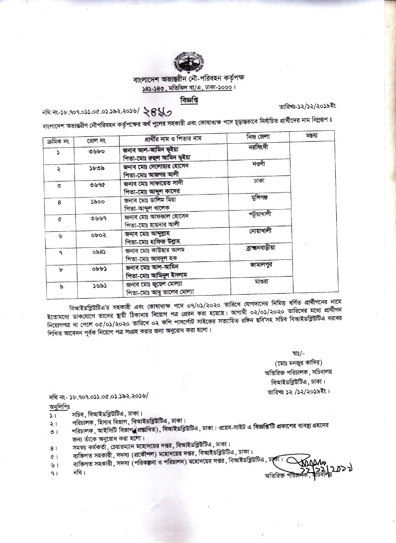 বাংলাদেশ অভ্যন্তরীণ নৌপরিবহন কর্তৃপক্ষের নিয়োগ বিজ্ঞপ্তি ১১/২০২২ এর কম্পিউটার অপারেটর পদে চূড়ান্ত ফলাফল। ২০-০৩-২০২৪